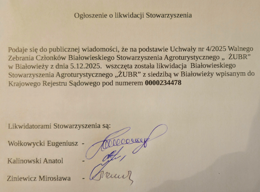 Podaje się do publicznej wiadomości, że na podstawie Uchwały nr 4/2025 Walnego Zebrania Członków Białowieskiego Stowarzyszenia Agroturystycznego "ŻUBR" w Białowieży z dnia 5.12.2025 r. wszczęta została likwidacja Białowieskiego Stowarzyszenia Agroturystycznego "ŻUBR" z siedzibą w Białowieży, wpisanym do Krajowego rejestru Sądowego pod numerem 0000234478.